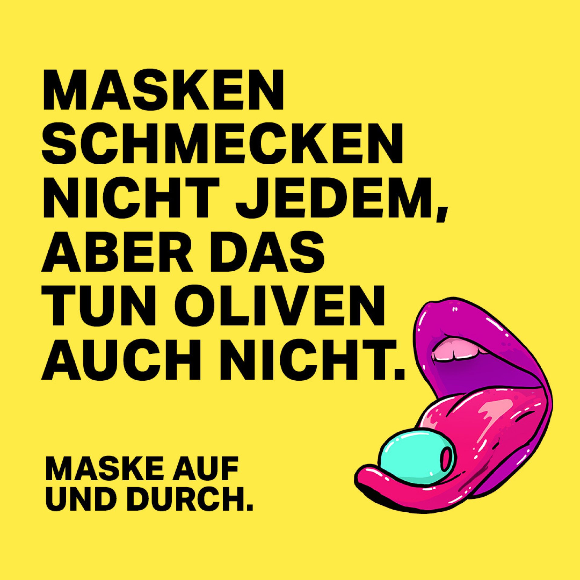 Die neuen Motive der zweiten Kampagne richten sich besonders an eine jüngere Zielgruppe, für die die aktuellen Kontaktbeschränkungen tiefe Einschnitte in ihr Alltagsleben darstellen. Starke Bilder und humorvolle, aber auch provokante Sprüche sollen ohne erhobenen Zeigefinger motivieren: „Masken schmecken nicht jedem, aber das tun Oliven auch nicht. Maske auf und durch!“ oder „Macht diesen Winter zum besten nächsten Sommer Eures Lebens.“ Diese und weitere Anzeigen werden ab sofort digital, auf Plakaten und in Print ausgespielt.