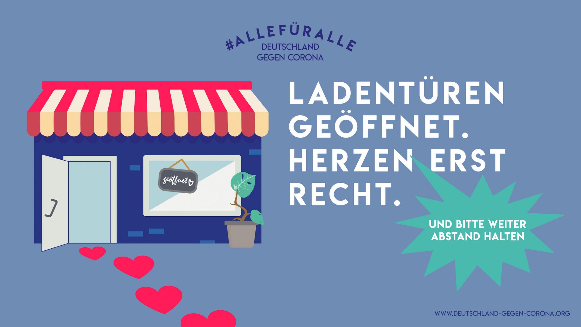 Die von uns im Frühjahr gegründete Initiative „Deutschland gegen Corona“ ruft mit dem Hashtag #allefüralle dazu auf, während dieses gesellschaftlichen Ausnahmezustandes an einem Strang zu ziehen und die aktuell wichtigste Regel in den Köpfen aller zu verankern: Zeigt Anstand – haltet Abstand! Gemeinsam möchten wir beweisen, dass Deutschland in dieser Zeit zu einer Solidargemeinschaft zusammenwächst – und dass Vernunft und Solidarität das Virus bekämpfen können.